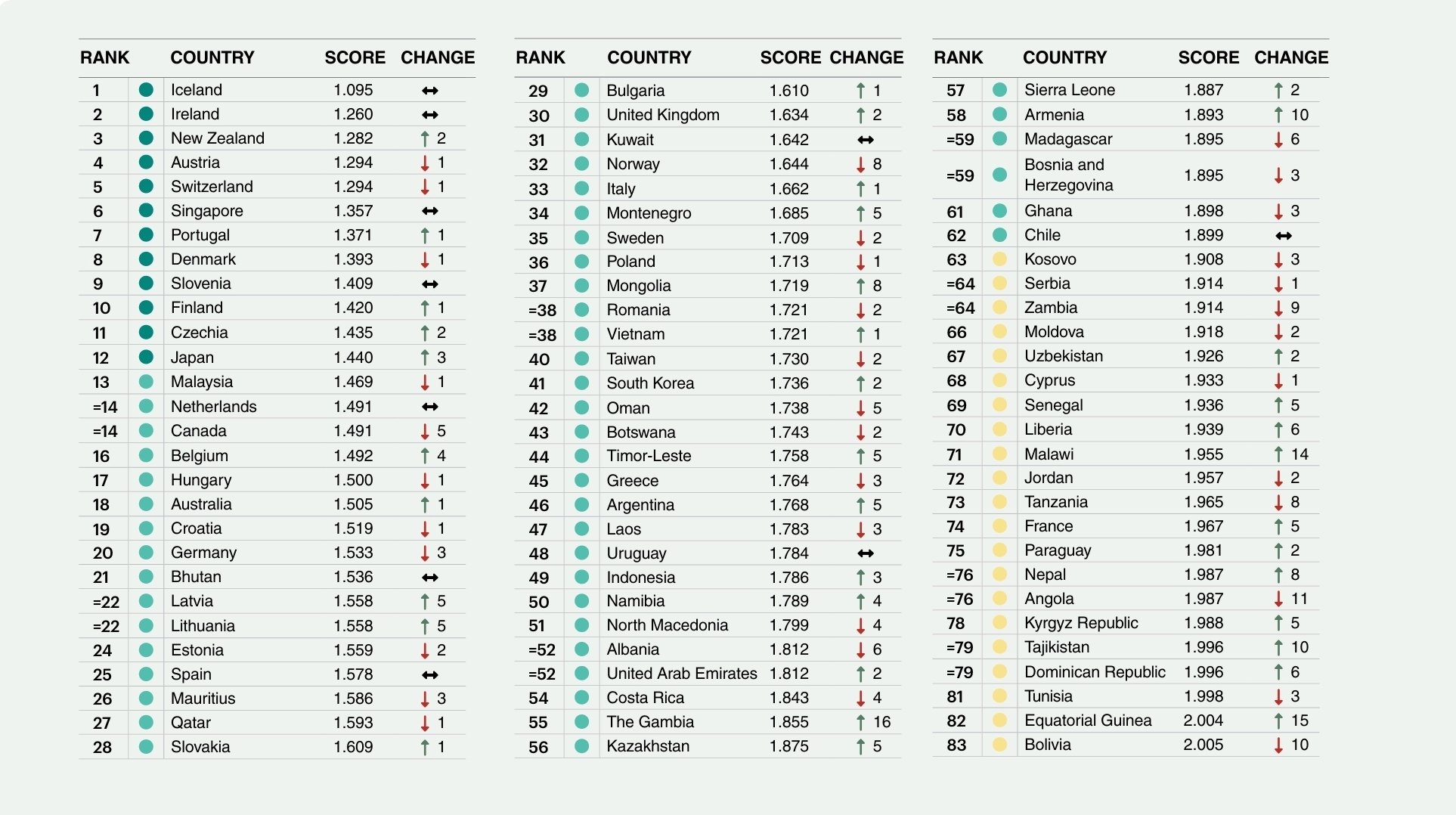 وبحسب التقرير، تصدّرت آيسلندا قائمة الدول الأكثر سلامًا في العالم بدرجة 1.095، محافظةً على موقعها الأول للعام السابع عشر على التوالي، تلتها إيرلندا في المركز الثاني بدرجة 1.260، ثم نيوزيلندا في المركز الثالث بدرجة 1.282، لتؤكد هذه الدول استمرار تفوقها في مجالات الأمن المجتمعي والاستقرار السياسي.