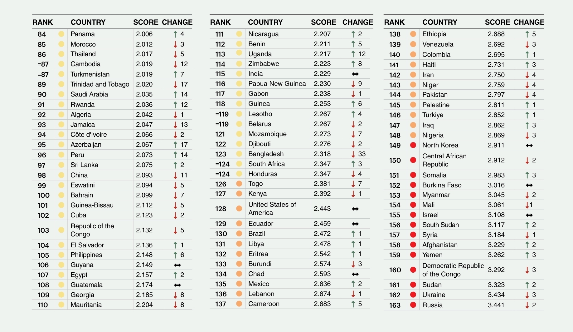 وفي المقابل، تذيّلت روسيا التصنيف العالمي في المركز 163 بدرجة 3.441، لتُسجَّل كأقل دول العالم سلامًا، تليها أوكرانيا والسودان في المراتب الأخيرة، نتيجة النزاعات المسلحة المستمرة وتداعياتها الأمنية والاقتصادية.