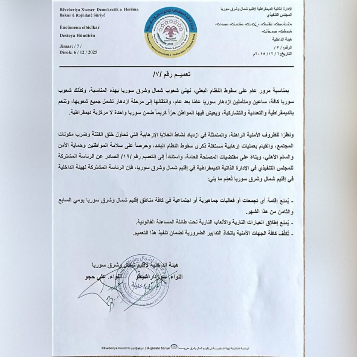 أصدرت “الإدارة الذاتية لشمال وشرق سوريا” تعميماً رسمياً يقضي بمنع إقامة أي تجمعات أو فعاليات جماهيرية في جميع مناطق سيطرتها يومي السابع والثامن من كانون الأول الجاري، وذلك بالتزامن مع الذكرى السنوية الأولى لسقوط النظام البائد وتحرير شمال وشرق سوريا.
