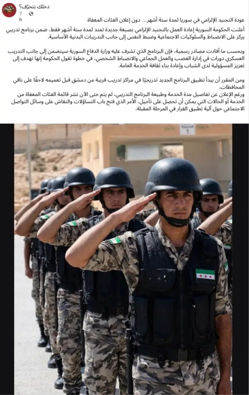 تداولت صفحات وحسابات على مواقع التواصل الاجتماعي خلال الأيام الأخيرة منشورات تزعم أن الحكومة السورية أعلنت إعادة العمل بالتجنيد الإجباري لمدة ستة أشهر فقط، ضمن برنامج تدريبي جديد تشرف عليه وزارة الدفاع، ما أثار حالة واسعة من الجدل بين السوريين داخل البلاد وخارجها.